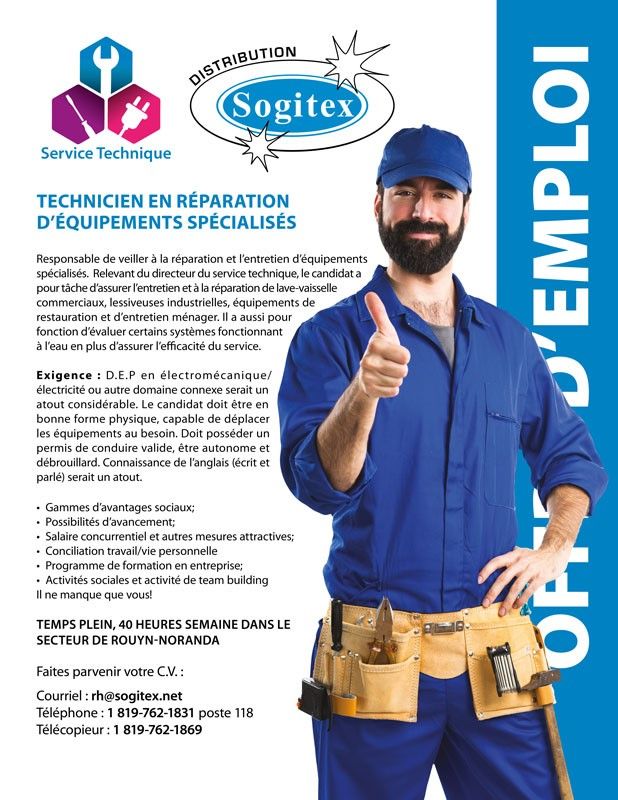 Responsable de veiller à la réparation et l'entretien d'équipements spécialisés. Relevant du directeur du servuce technique,le candidat à pour tâche d'assurer l'entretion et à la réparation de lave-vaisselle commerciaux. lessiveuses industrielles, équipements de restauration et d'entretien ménager. Il a aussi pour fonction d'évaluer certains systèmes fonctionnant à l'eau en plus d'assurer l'efficacité du service.